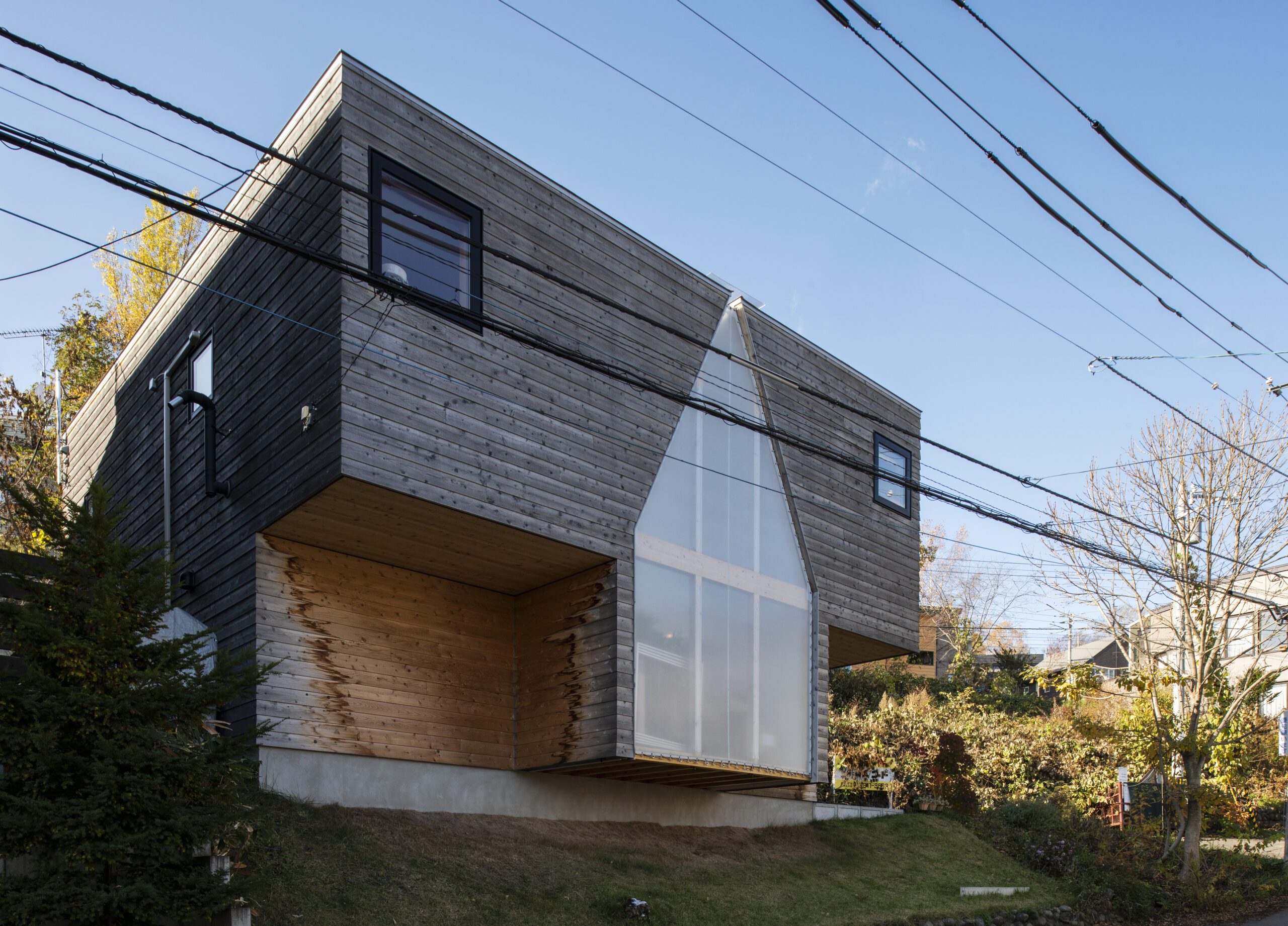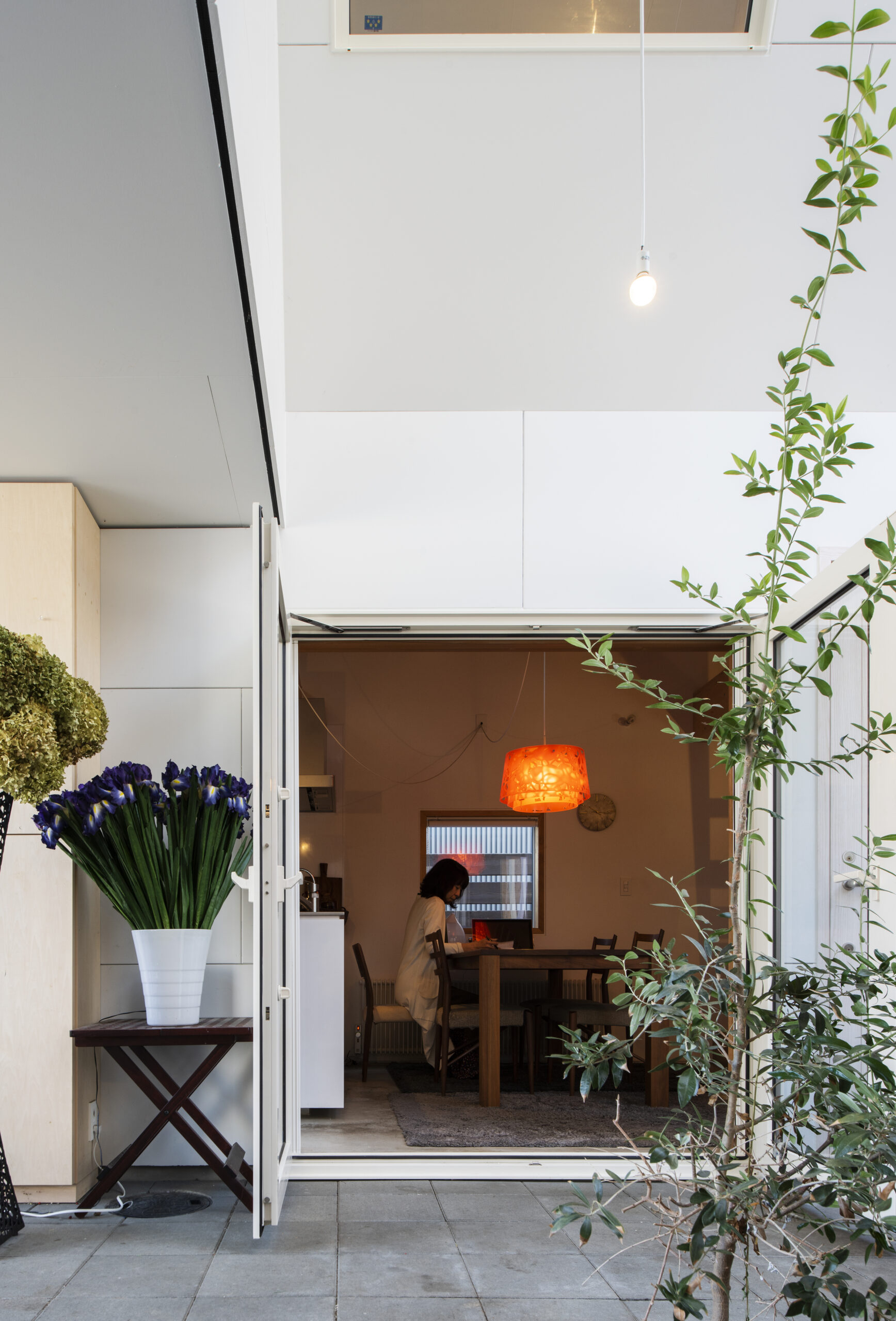 札幌市の変形・傾斜地に立つMさん宅は、フラワーアレンジメントを営む奥さんが建築家・髙木貴間さんとともに土地の特性を生かして完成させた住まい。 中心に半屋外テラスを設け、アトリエとガラス張りのダイニング・キッチンが向かい合う構成が特徴です。 テラスは作業場や家族のセカンドリビングとして活用され、季節を通じて自然を感じられる空間に。 限られた予算と土地条件の中で、暮らしと仕事を心地よく両立させた住まいとなっています。