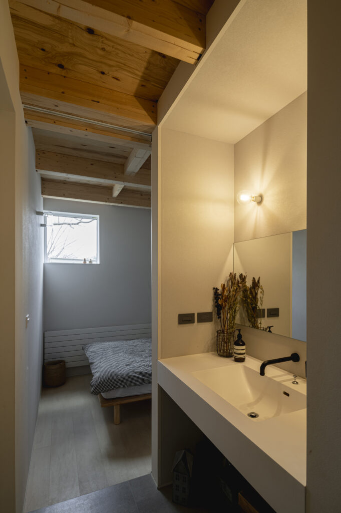 テキストが入ります。函館近郊の緑豊かな地に立つ、「自然を感じながら暮らしたい」という夫妻の要望から生まれた住居兼店舗。 約100坪の敷地に、住居棟「オオヤマ」と店舗棟「コヤマ」をエントランスで分けて配置し、片流れ屋根が山並みと調和しています。 住居棟は勾配天井のLDKと大開口が開放的で、店舗棟は構造材を現しにした温かみのある仕上げ。 モルタル外壁やグレーの壁が周囲の自然と一体化し、日常に豊かさをもたらします。